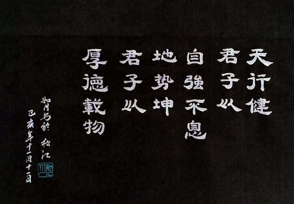 中国「易経」の言葉です。意訳:「天は健やかに動き続けるものであり、君子は常に自己を鍛え、努力をやめないことが大切だ。地は広くて包容力に富み、君子は厚い徳を持って物事を支え、導くべきだ。」