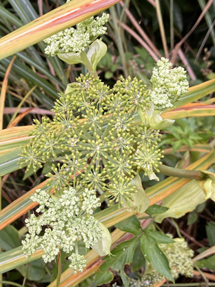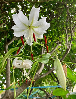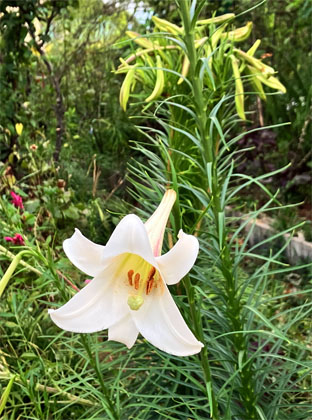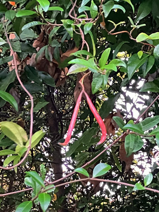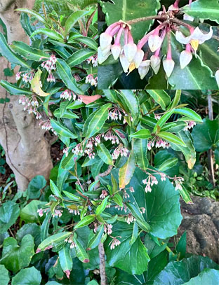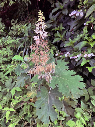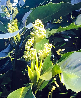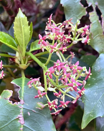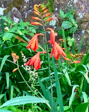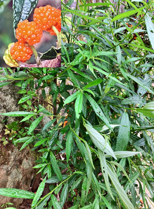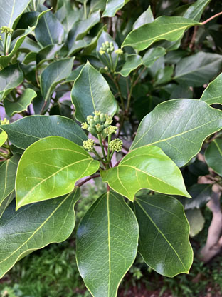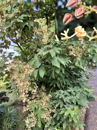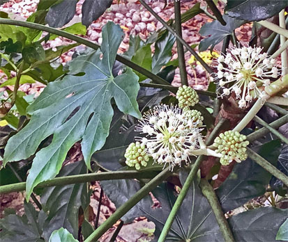 カクレミノ隠れ蓑ウコギ科Dendropanax trifidus; ヒメヒオウギズイセン姫檜扇水仙アヤメ科Crocosmia x crocosmiiflora; ③カサブランカユリ科Lilium ‘Casa Blanca(栽培逸出)