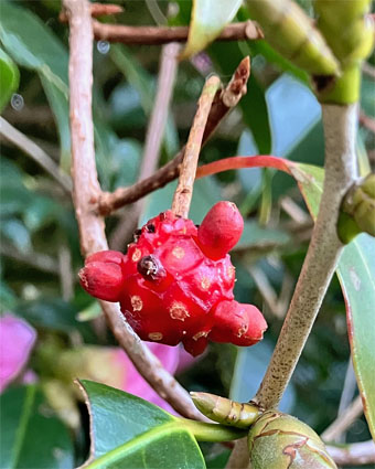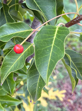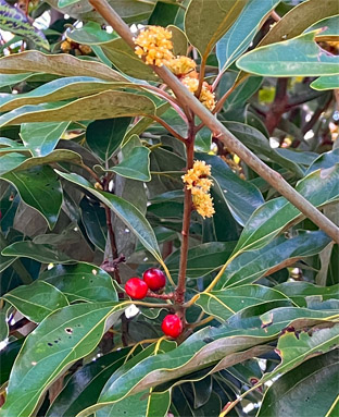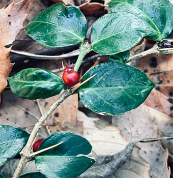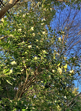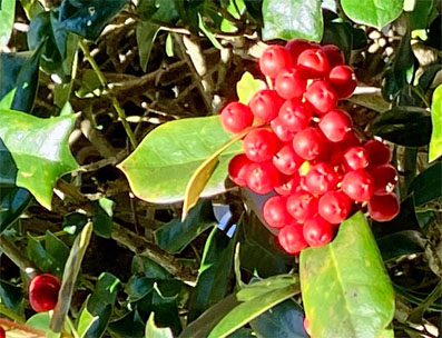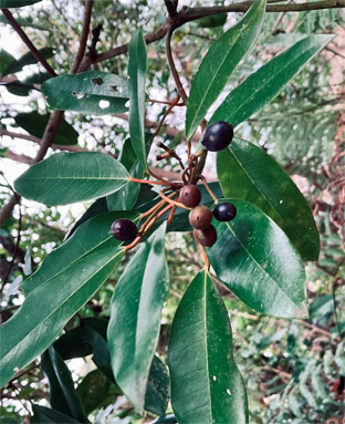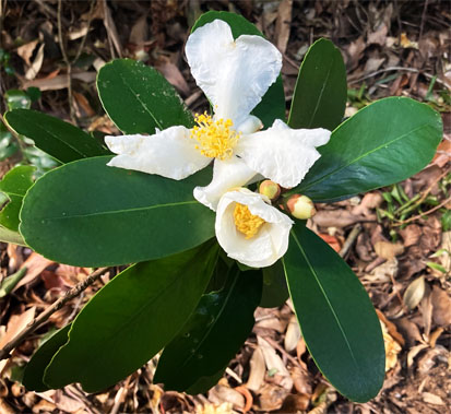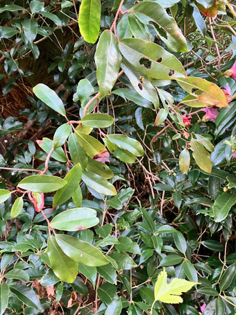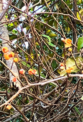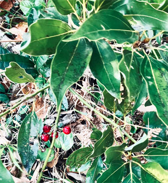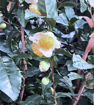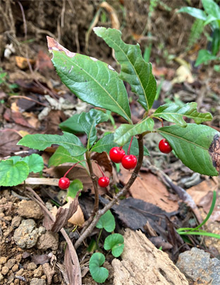 トキワサンサシバラ科Pyracantha coccine;  ② ヤブコウジ・(紫金牛)・サクラソウ科Ardisia japonica;  ③チャ・茶ツバキ科Camellia sinensis(お茶の木、栽培逸出、野生になったのようです); ④ テイカカズラ・定家葛・(絡石藤)・キョウチクトウ科 Trachelospermum asiaticum;  ⑤ シロダモ・(台湾新木姜子クスノキ科 Neolitsea sericea;  ⑥ メマツヨイグサ・雌待宵草・(月見草)・アカバナ科Oenothera biennis(北米原産の帰化植物です。山野、道端、空き地に大きい集団や、海浜の砂地にも見かけたことがあります。)