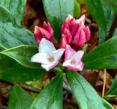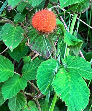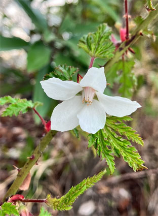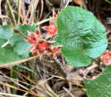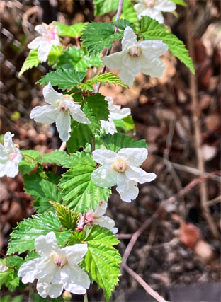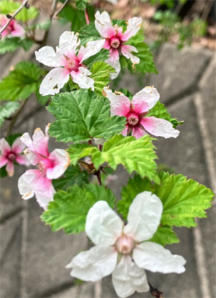 ④⑤ニガイチゴバラ科Rubus microphyllus (野外の山に白、赤ピンクの花色の変異が見られます。2025,04,10撮影、朝日山)