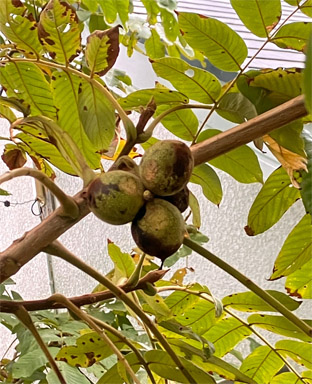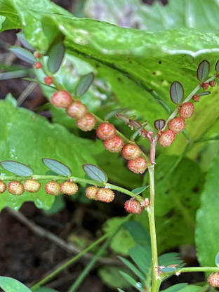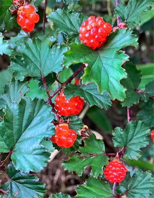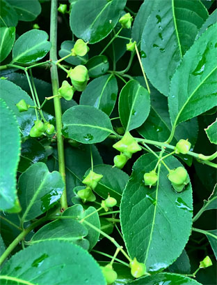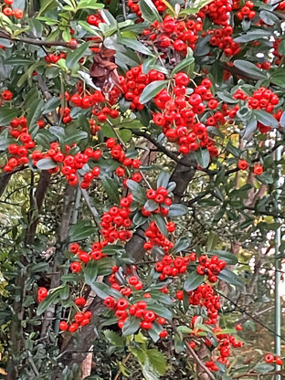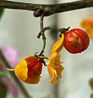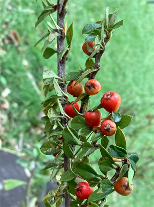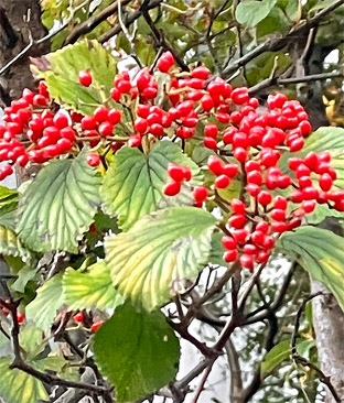 クルミ クルミ科Juglans mandshurica var. sachalinensis;   ②ベニシタン紅紫檀・バラ科Cotoneaster horizontalis;  ③ソヨゴ・冬青・モチノキ科Ilex pedunculosa;  ④アシタバ・明日葉セリ科 Angelica keiskei ミズヒキ・水引・タデ科 Persicaria filiformis