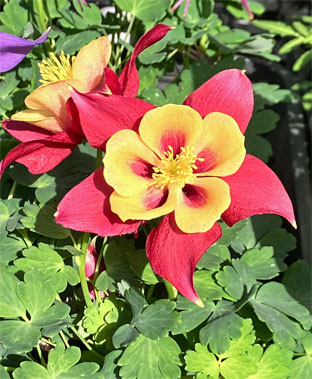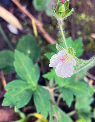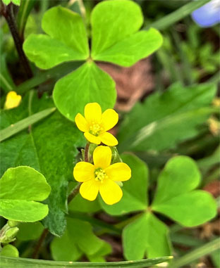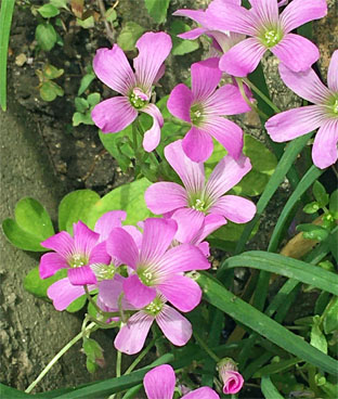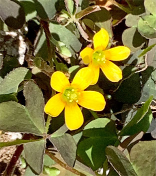 カタバミ科:①ムラサキカタバミOxalis debilis(外来帰化種);  ②カタバミOxalis corniculata ・酢漿草  ③アカカタバミOxalis corniculata  f.  rubrifolia (カタバミの品種、葉が赤紫、花冠の喉部が赤くなることが多い)(20250405撮影、網代山)