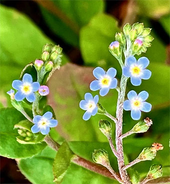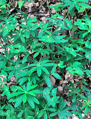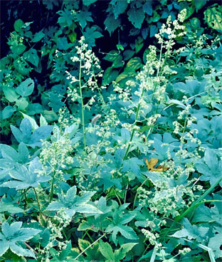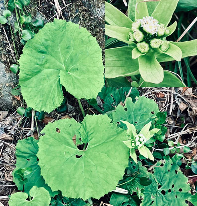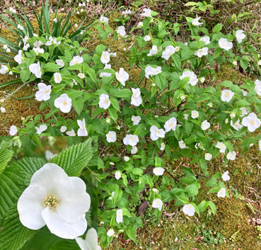 トキワツユクサツユクサ科Tradescantia fluminensis;    ②ヤブレガサキク科Syneilesis palmata;  ③イズトウダイグサトウダイグサ科Euphorbia sieboldiana var. izuensis ;  ④ウツギ(空木)アジサイ科Deutzia crenata ;  ⑤ホタルブクロ(蛍袋)キキョウ科Campanula punctata ;  ⑥ニガイチゴバラ科Rubus microphyllus