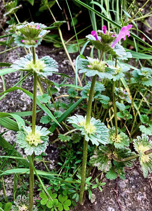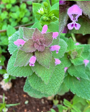 シソ科ホトケノザLamium amplexicaule; ②ヒメオドリコソウLamium purpureumキランソウAjugaciliata var. villoszior