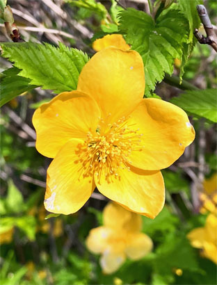 バラ科:①ヤマブキKerria japonica山吹  ②クサイチゴRubus hirsutus(2025,04,10撮影、網代山)
