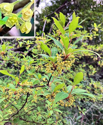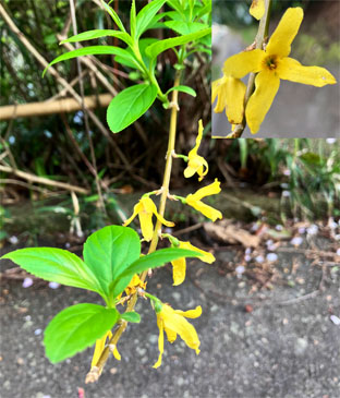 レンギョウモクセイ科・連翹Forsythia suspensa;  モミジイチゴバラ科Rubus palmatus var. coptophyllus;  ⑥白ヤマブキバラ科 Rhodotypos scandens