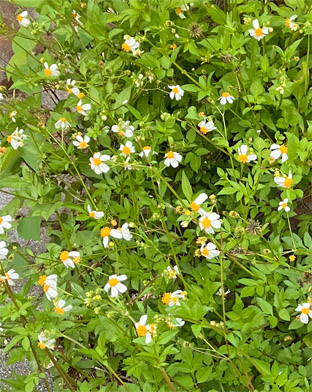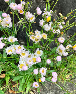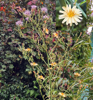 キク科 : ⑤タチアワユキセンダングサ・立淡雪栴檀草・Bidens pilosa var. radiata; ⑥コセンダングサBidens pilosa;  ⑦アキノノゲシ・秋の野芥子Lactuca indica ;   ⑧ ホソバノノゲシLactuca indica f. indivisa (前者との違いは葉が分裂しない)