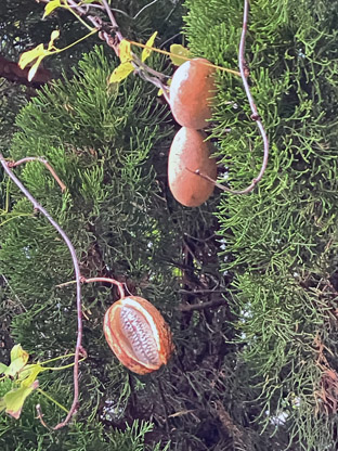 オニドコロDoscorea tokoro ヤマノイモ科)、つる性の多年草。ヤマイモの仲間ですが、芋が有毒です。雌雄異株で、葉のわきから長い花序を生じ、雌株は秋に楕円形の三翼の果実多数が暖簾のようにぶら下がります(写真、網代,2024,12、撮影)