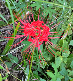 オオニシキソウ・大錦草トウダイグサ科Euphorbia nutans;    ②シギンカラマツ・紫銀唐松・キンポウケ科Thalictrum actaeifolium;   ③アザミ(薊キク科Cirsium sp. (ノハラアザミ・野原薊Cirsium oligophyllum);  ④ ミツバアケビ三葉木通アケビ科Akebia trifoliata; ⑤ヒガンバナ彼岸花(石蒜)ヒガンバナ科Lycoris radiata ; ⑥アメリカセンダングサキク科 Bidens frondosa