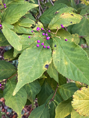 ムラサキシキブシソ科 Callicarpa japonica ;   ② コウヤボウキ・高野箒・(长花帚)キク科Pertya scandens; ③ アキノキリンソウ・(一枝黄花)・キク科Solidago virgaurea var. asiatica