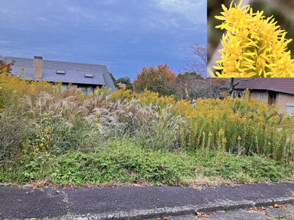 セイタカアワダチソウ・背高泡立草(加拿大一枝黄花)キク科Solidago altissima(北アメ リカ原産のキク科 Composiate アキノキリンソウ属の多年草植物であり,日本生態学会により「日本の侵略的外来生物ワースト100」に指定されている。この写真は本種がある空き地に巨大な集団を形成している様子です。繁殖力が強く、逸出、蔓延、自然環境に影響することが懸念されます)。