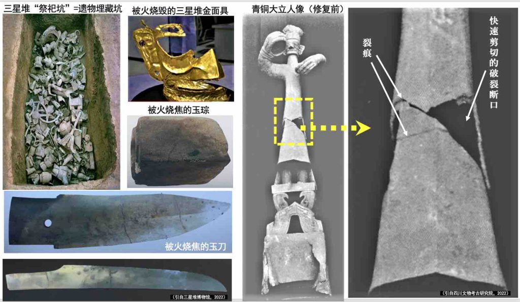首先,就从所谓的“祭祀坑”说起。三星堆遗址的 8 个考古发掘坑出土了 1 万 多件青铜器和金器以及其他贵重物品。这些遗物大多数都有被破坏和被大火烧毁 的痕迹。这个图中显示的金面具就被烧毁熔解掉了一半,玉琮和玉刀也都被火烧 焦成黑灰色了。而青铜大立人像则被拦腰折断,就像被打破的玻璃那样,具有脆性破裂的特征。本书详细论证了这些具有被破坏和烧毁痕迹的青铜器和金器等遗 物,是被突发性大地震的快速剪切破坏并被地震引起的火灾烧毁的贵重物品和宗 教器具。因此,所谓的“祭祀坑”,既不是用于祭祀仪式,也不是专门用于埋藏祭 祀器具的“祭品埋藏坑”,而是用于埋藏被大地震破坏和烧毁的各种贵重物品和宗 教器具的土坑。