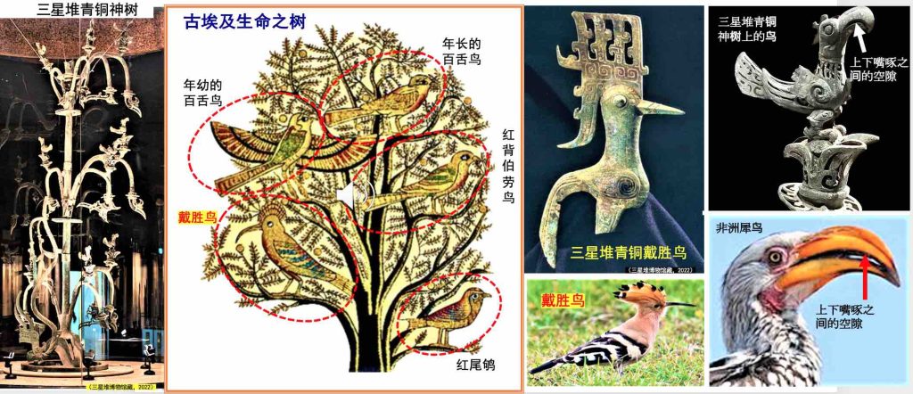 三星堆遗址出土了许多被称为“青铜神树”的青铜器。如图所示,这种神树的造型特征及其所具有的宗教涵义,都与距今 4000 多年前的西亚和古埃及的生命之 树非常相似。在三星堆青铜神树上,不仅有援树而下的中国飞龙,也有古蜀国不 存在的戴胜鸟、非洲犀鸟、人首鸟身像和睡莲花蕾。而这些鸟和睡莲花却是古埃 及和西亚文明古国的被崇拜的神鸟和神花,具有重生和复活的宗教涵义。本书论 证了三星堆青铜神树是古埃及和西亚神教文化与中国传统文化相结合的多元文化 的结晶体。