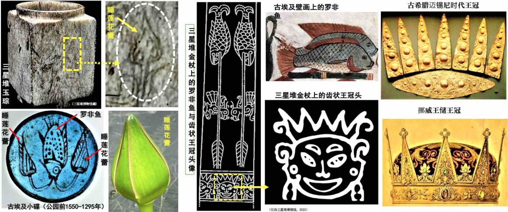 上述的睡莲花蕾纹饰图案也出现在中国起源的三星堆玉琮上。而这种形态的 睡莲花蕾也常常与罗非鱼一起出现在古埃及的壁画和彩陶小蝶上。令人惊奇的是, 在三星堆金杖和金沙遗址出土的金冠带上也有如出一辙的罗非鱼和神鸟以及戴着 齿状王冠的国王头像的图案。本书揭示了中国起源的许多玉石器也渗入了古埃及 和古西亚文明的文化因素;而具有睡莲花与罗非鱼以及戴着齿状王冠的国王头像 的纹饰和造型的三星堆青铜器和金器,则是起源于古埃及和古希腊文明古国。