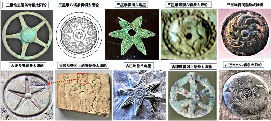 三星堆遗址出土了许多青铜太阳轮与象征太阳的圆形和星形纹饰的青铜器, 其造型和纹饰特征都与古埃及和西亚文明古国的太阳轮以及古印度文明的青铜太 阳轮造型和纹饰特征几乎如出一辙。通过对考古资料和遗物的造型特征的分析, 本书论证了三星堆青铜太阳轮、金沙遗址出土的太阳神鸟金饰、象征太阳的文物造型和各种纹饰以及太阳崇拜的文化,也都可能是起源于古埃及和西亚文明古国 的太阳崇拜的神教文化。