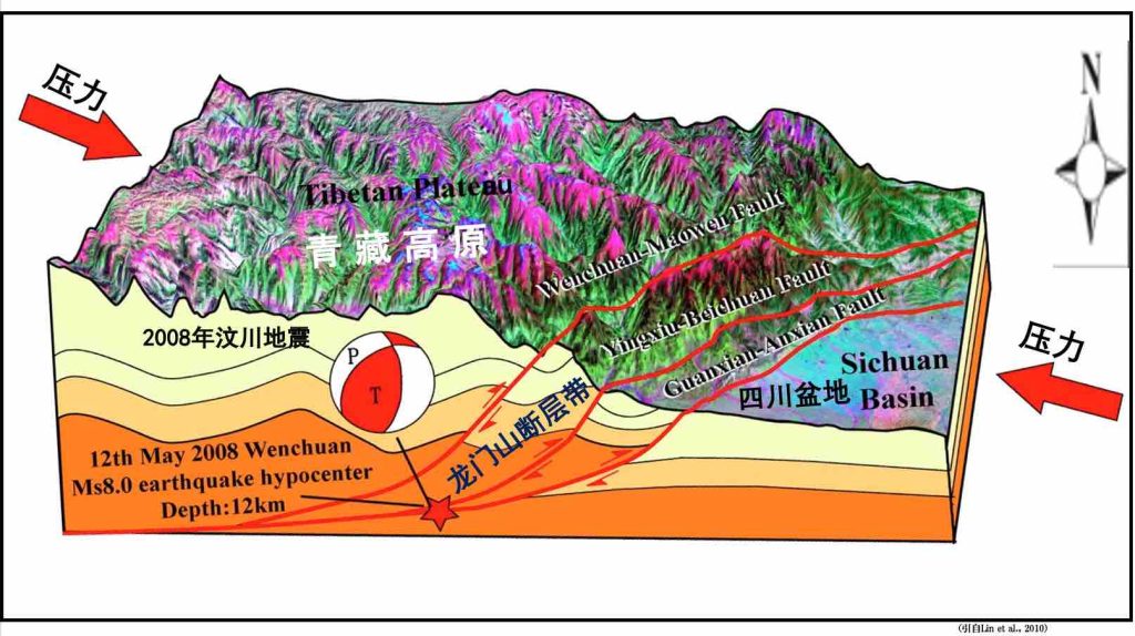 《三星堆文明的兴亡与大地震》一书,精辟地论述了三星堆文明的兴亡与大 地震具有共生共存的关系。地质研究表明,青藏高原由于受印度和欧亚板块的南北向碰撞挤压而隆起并同时被向东挤出,从而沿着龙门山活动断层带向东侧的四 川盆地逆冲而上。龙门山脉与四川盆地之间的海拔高差达到 4 千—7 千米,如此 陡峭的地形地貌是在过去一千多万年漫长的地质岁月里,由龙门山活动断层带持 续发生的大地震所形成。