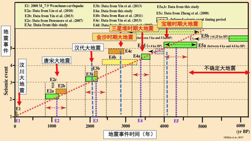 古地震研究结果显示,龙门山活动断层带,平均每一千年就会产生一次 2008 年汶川大地震级别的大地震。如图所示,在宝墩文化期和三星堆文化期以及金沙 文化期,都分别发生了大地震。这种周期性发生的史前大地震,正是造成古蜀文 明三起三落的主要原因。本书所考证的三星堆遗址的遗迹和遗物以及古蜀国的公 共墓地群的各种特征 现象,证明了最近五千多年的古蜀文明的三起三落的兴衰史, 正是与发生在龙门山活动断层带的大地震共生共存的文明发展过程的印证,而这 种与大地震共生共存的关系,在将来几千年乃至几万年,还会一直延续下去,这 是大自然的铁定规律,也是天府之国的宿命。