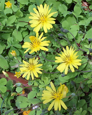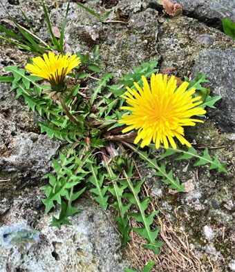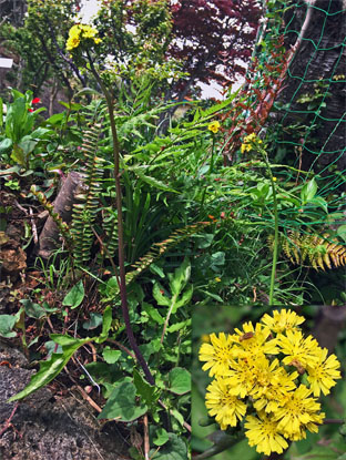 ①イワニガナ(岩苦菜)Ixeris silonifera、②ヤブタビラコLapsanastrum humit (4月19日撮影);③ クサイチゴRubus hirsutus(2025,04,10撮影)